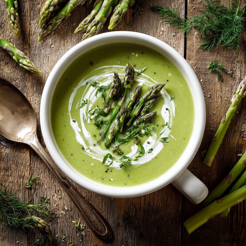 - 5️⃣ Stir in heavy cream, lemon juice, salt, and white pepper. Taste and adjust seasoning. Serve hot, garnished with blanched asparagus tips.